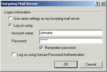 Select Log on using. In the Account name field, type your full RallsTech email username (e.g., johndoe). In the Password field, type your password. Check the box next to Remember password. Click the OK button.