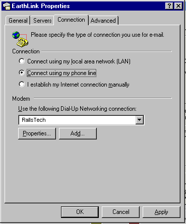 Click on the Connection tab. Click the Connect using my phone line radio button in the Connection area. Click the down arrow on the Use the following Dial-Up Networking connection drop-down list and choose your connection. Click the OK button.